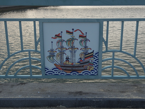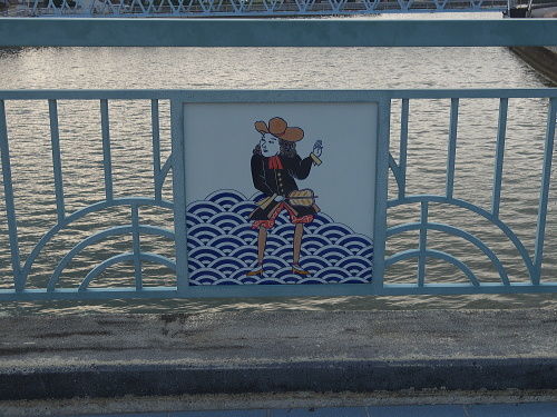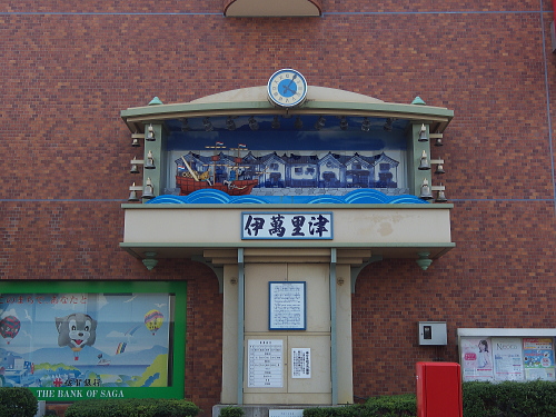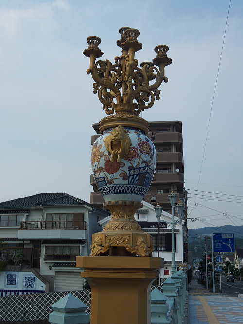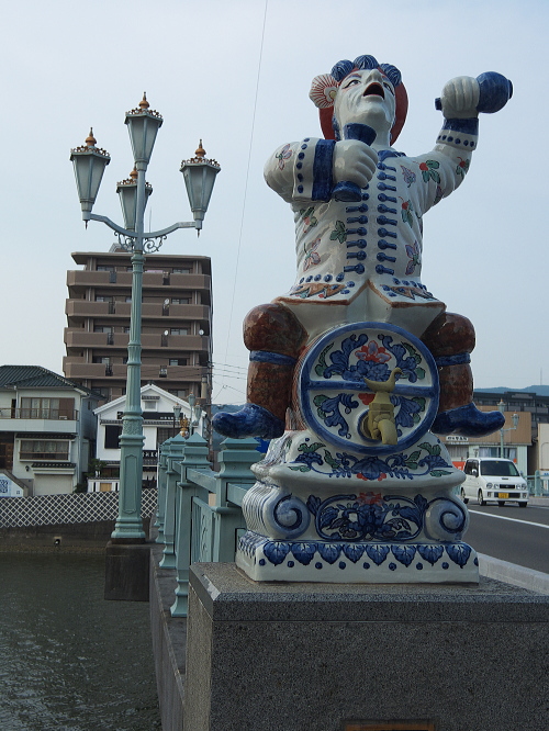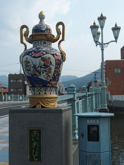 | 佐賀県伊万里市中心部を流れる伊万里川に架かる橋で、橋には陶磁器が設置されており、江戸時代に焼物の積出港であった事を象徴しています。また、相生橋近くにある佐賀銀行の壁にはからくり時計が設置されており、定刻になるとからくり人形が動き出して、見る人を楽しませてくれます。 |