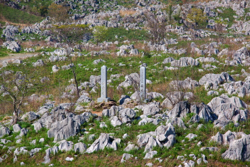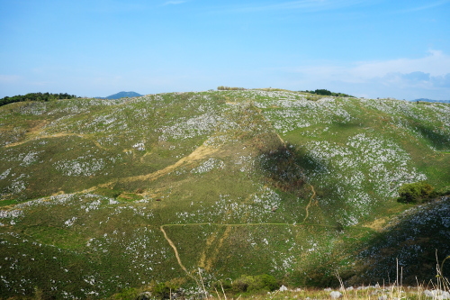 | 秋吉台は美祢市の中・東部に広がる日本最大のカルスト台地です。 1955年に国定公園(秋吉台国定公園)に、1964年に特別天然記念物に指定されています。北東方向に約16km、北西方向に約6kmの広がりを有し、台地上の総面積54㎢・石灰岩の分布(沖積面下の潜在部を含む)総面積93㎢・台地面の標高180~420mと広大な台地には緑の絨毯を敷き詰めたような景色に、むき出しの石灰岩で、自然の偉大さを感じることができます。石灰岩は3億年前の昔は、海の中の珊瑚礁として生まれたそうです。 |