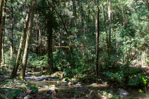 | 秋芳洞に続く道沿いは木々と川が流れています。 |