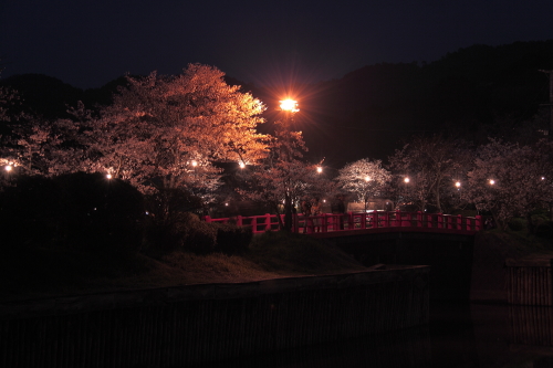 | ライトアップされた桜の木と池に架かる橋。 |