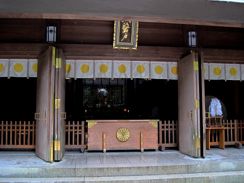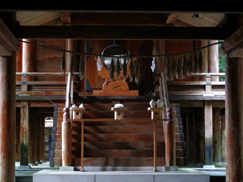 | 本殿裏にある神水に祭られている円型の鏡。ここの神水は、信仰者の方が飲用に使っているようです。 |