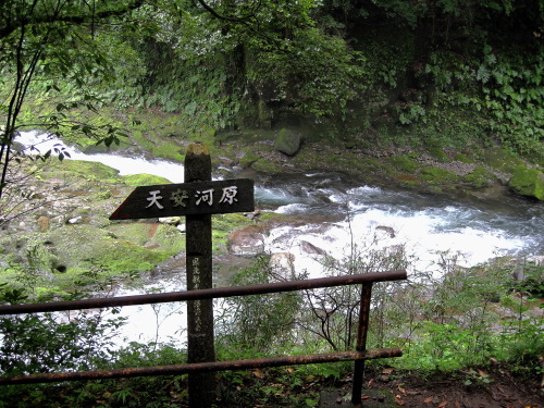 | 天岩戸神社は、岩戸川を挟んで西本宮と東本宮とあり、昔は別々の神社でしたが、昭和45年に天岩戸神社として合併した神社です。祭神は別々の名前ですが、どちらも天照大神の事です。東西両本宮ともに皇祖神天照大神を祀るとはいえ、創祀以来皇室や朝廷からではなく、在地住民からの信仰を主としています。 天安河原と呼ばれる洞窟は、岩戸隠れの際に八百万の神々が集まって相談した場所であると伝えられています。河原の中央部にある仰慕窟(ぎょうぼがいわや)と呼ばれる洞窟には天安河原宮があり、思兼神を主祭神として八百萬神が祀られています。お参りすると、その者の願いは何でも叶うそうです。 |