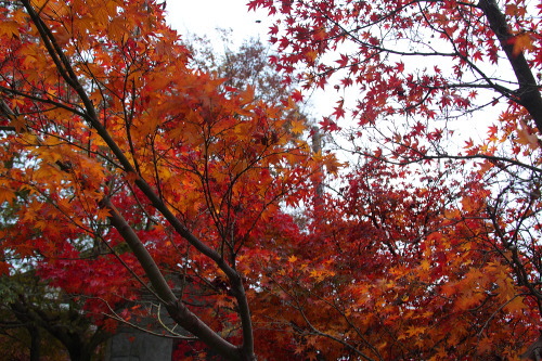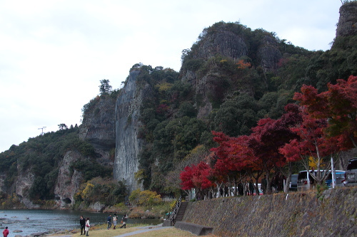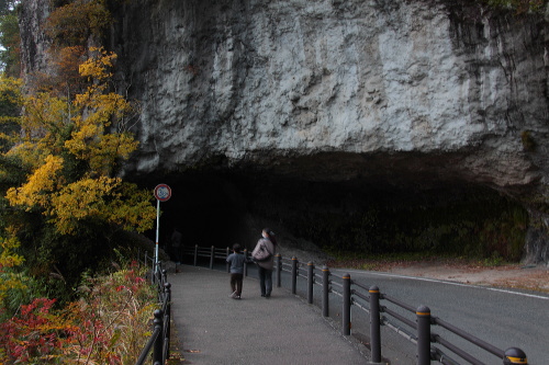 | 青の洞門に紅葉しているもみじ。 |