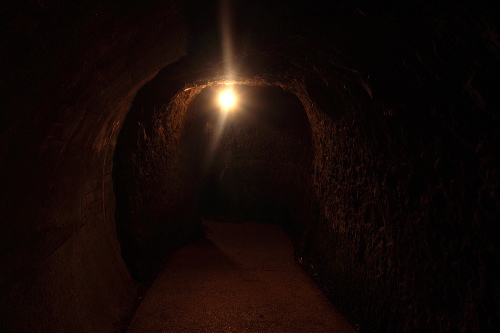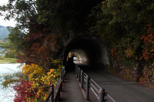 | 青の洞門は中津市本耶馬溪町にあり、大分県の史跡に指定されている全長342mのトンネルで、昔、断崖絶壁で鎖だけで結ばれていた難所であった所に、諸国遍歴の旅で寄った禅海和尚が托鉢歓進で集めた資金を元に、石工を雇い、30年かけてノミと槌だけで掘り抜いたトンネルと言われており、その後は通行料を徴収していたという話が伝えられて、日本最古の有料道路とも言われています。現在では、自動車が通れるように幅が広げられていて、時間帯により片側相互通行になっています。 |