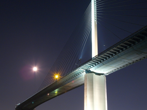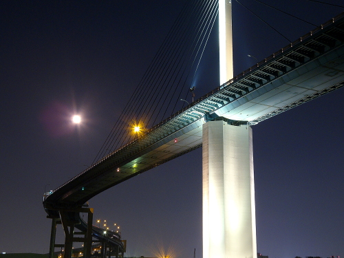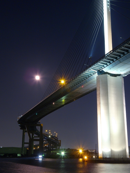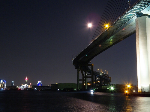 | 荒津埠頭からライトアップされた荒津大橋を見上げる。 |