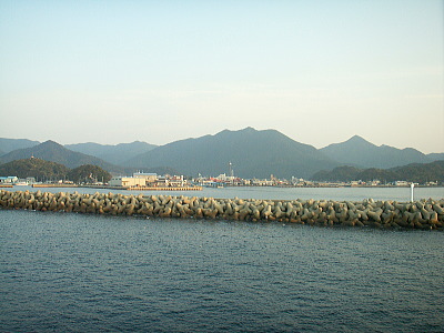 | 入港時、フェリーから見た有川港と有川市街。多くの釣り客がこの港に降り立ちます。 |