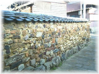 | トンバイ塀。登り窯を解体した後のレンガやトチン・ベンジャラなどの陶片を赤土で固めた土塀です。 |