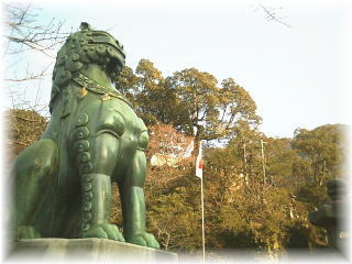 | 陶磁器製の狛犬。踏切を渡ったすぐのところにあります。 |