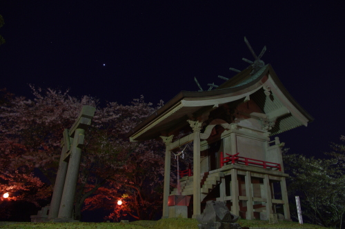 | 朝日山の山頂にある社と桜。 |