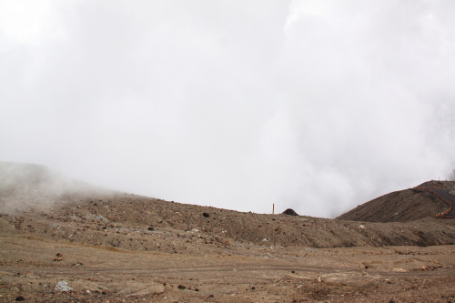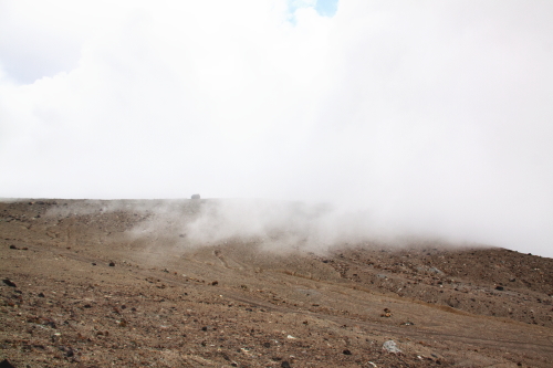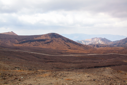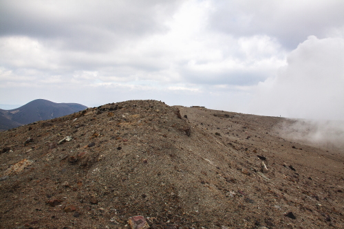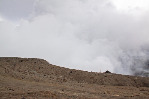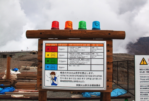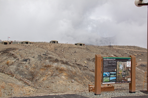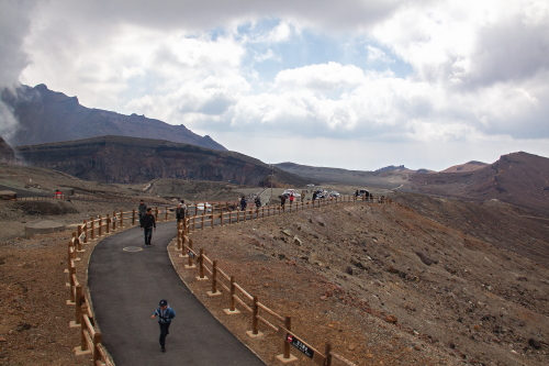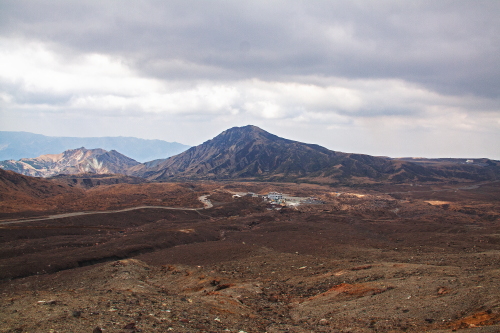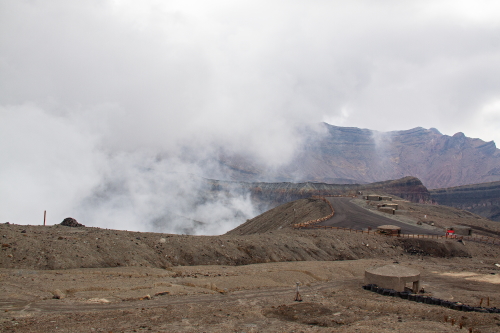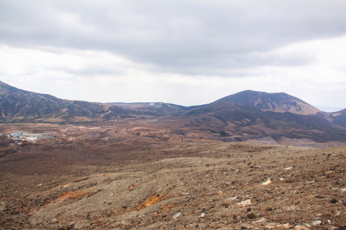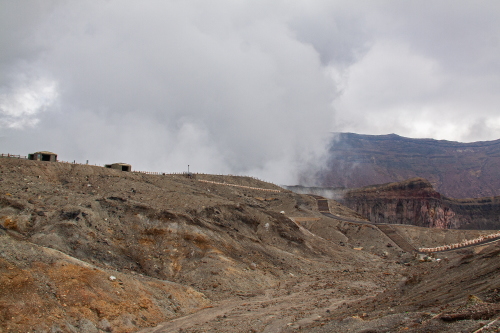 | 阿蘇中岳山頂には火山火口があり、その日の状況によって立ち入り規制等がありますが、条件がいい日は火口を眺める事が出来ます。火口湖(湯だまり)は火口底に雨水や湧水がたまり、マグマに熱せられてお湯になっています。温度は90度を超えることもあり、湖水はPH1以下の強酸性でエメラルドグリーン色です。Dゾーンには展望台も設置されており、阿蘇中岳火口の他に草千里や砂千里などの雄大な光景を眺める事も出来ます。 ※この日は規制により火口は眺められませんでした。 |