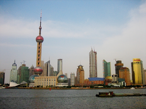 | 外灘から発展が進んでいる浦東地区の高層ビル群を望む。 |