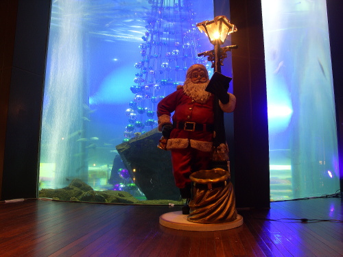 | 主要航路の桟橋であり、港湾施設であるベイサイドプレイス博多では、12月上旬からクリスマスまでの間、アクアリウムと呼ばれる水槽の中にクリスマスツリーが飾られます。ベイサイドプレイスの建物もLEDのイルミネーションが点灯され、クリスマスらしい雰囲気になります。 |