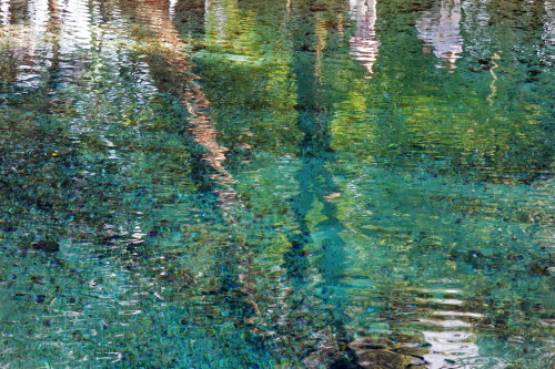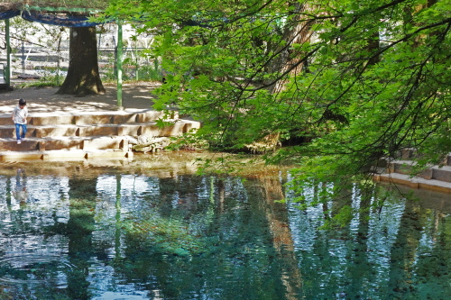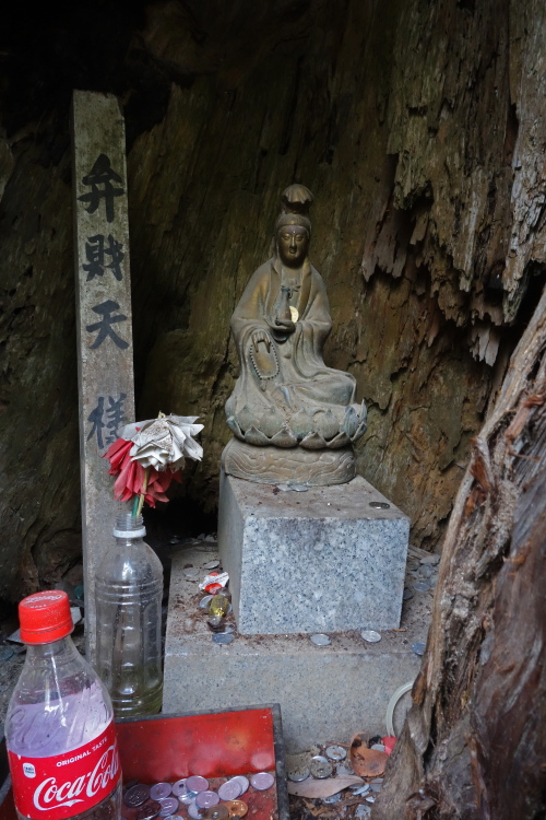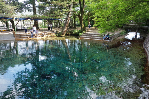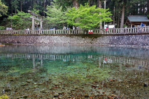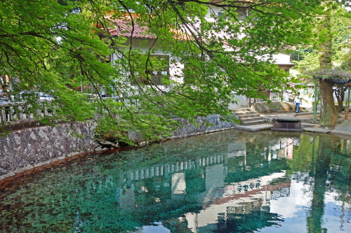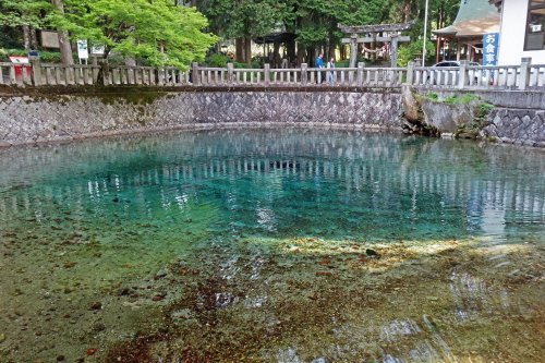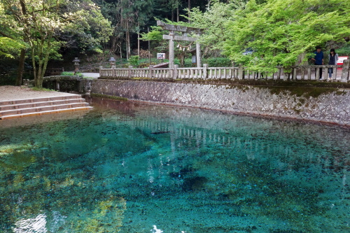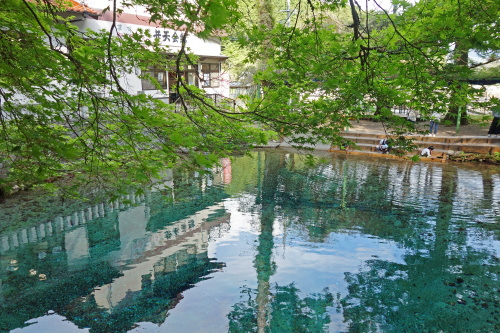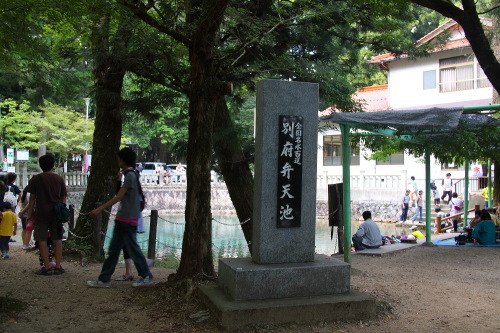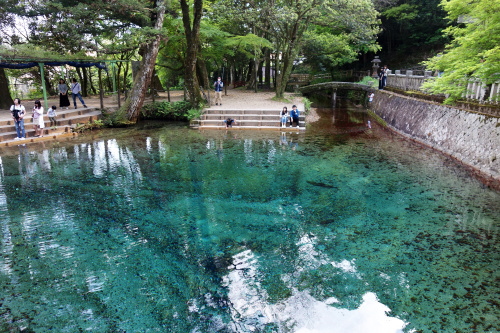 | 環境省指定・日本名水100選である別府弁天池は、水深4mの地底から湧き出るカルスト台地特有の清冽な水で、一帯はコバルトブルー一色で美しく冷たいです。この水は飲料水や養殖している水にも使われています。また別府厳島神社の境内でもあり、その昔、辺りを開墾したものの水不足に悩む長者が、夢のお告げ通りに弁財天を勧請すると水が湧きだしたという伝説を持ち、毎年秋にはこの神与の水に感謝の気持ちをこめ、念仏踊りが奉納されています。 |