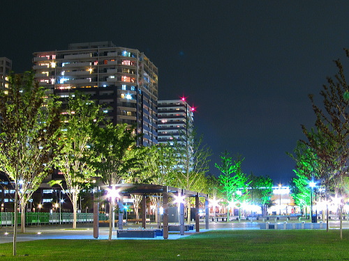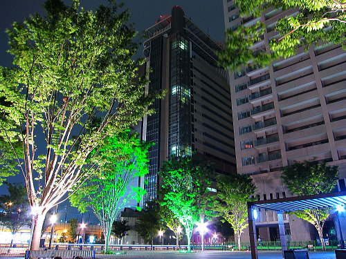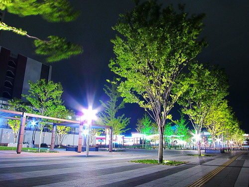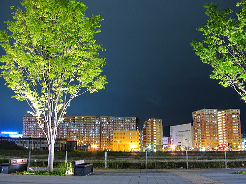 | 福岡市の副都心・香椎地区で開発が進んでいる「JR・西鉄千早駅」前に、千早並木広場があります。千早並木広場は、福岡市住宅都市局が運営している広場で、平成23年春に国道側の広場が完成しました。夜になると並木がライトアップされ雰囲気がよく、開発されている千早地区の高層マンションの灯りを観賞できます。 |