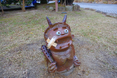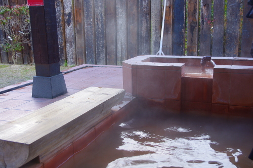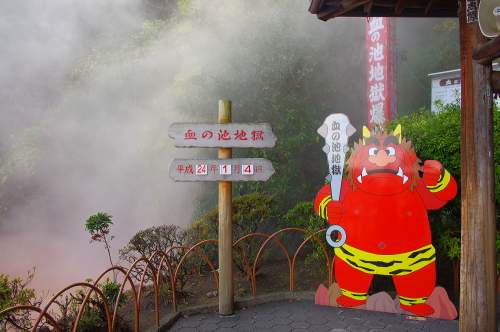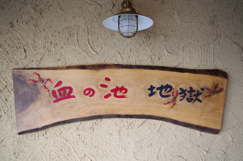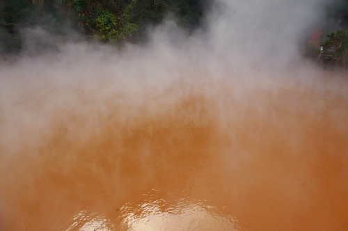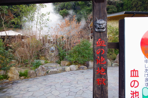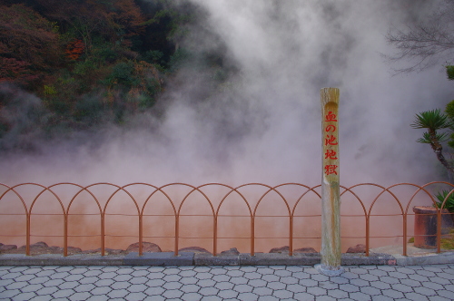 | 別府の鉄輪温泉街から北に外れた場所に血の池地獄があります。血の池地獄は日本最古の天然地獄として、平成21年に国の名勝に登録された地獄です。広さ1300u・深さ30m以上・摂氏78度で、酸化鉄や酸化マグネシウムなどにより赤い色になっているそうです。 |