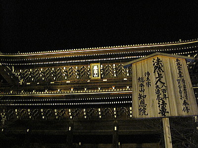 | 特別拝観でライトアップされた知恩院の三門は、元和7年(1621)、徳川二代将軍秀忠公によって建立されたもので、高さ24メートル、横幅50メートル、屋根瓦約7万枚。その構造・規模において、わが国現存の木造建築として最大の二重門です。 その近くの円山公園では現代いけばな展のライトアップが開催されています。 |