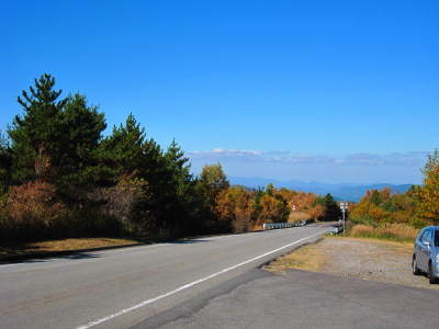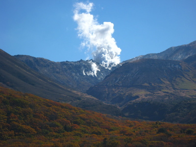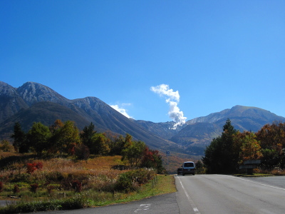 | 長者原手前のやまなみハイウェイから見た八丁原地熱発電所の煙。 |