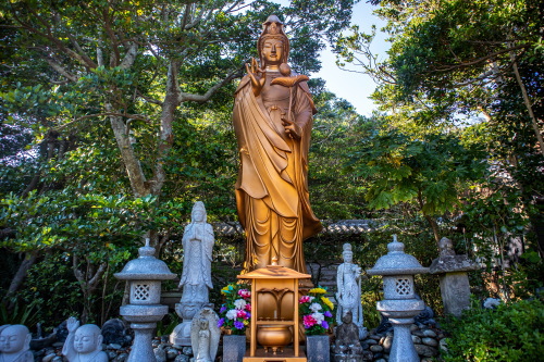 | 弥勒山観音院大寶寺は高野山真言宗の寺院で、西天竺のマガタ国より不須仙人がやって来て、エンダゴンという金属で鋳造されて「聖観世音菩薩」を奉持し玉之浦笹海の小高い丘に祀って「観音院」と称したことが伝わっており、この聖観音像は信濃の善光寺・東京浅草の観音と共に「日本三大秘仏」の一つと言われています。 701年に震旦の国(現在の中国)より三論宗の祖師・道融和尚が来朝し弥勒山観音院大宝寺を開創したのが始まりとされています。また第41代持統天皇の勅願寺でもあります。開創後の806年には唐から帰朝の途中に大宝の浜に漂着した弘法大師(空海)が真言密教の講演をこの寺で行い、三論宗から真言宗に改宗したとされ「西高野山」と称されるようになりました。室町時代の涅槃図や我が国最古の大般若経・1375年に播磨国多賀郡西林寺の僧増進が渡唐に際して、航海安全を祈願して寄進した梵鐘があります。 現在では五島八十八カ所の第87番・第88番札所として結願の寺として参拝者が訪れており、境内には大師堂の回りを歩く四国八十八箇所霊場お砂踏みや弁財天堂・奥の院・大日如来堂等見所満載です。 御本尊:聖観世音菩薩 |