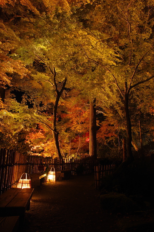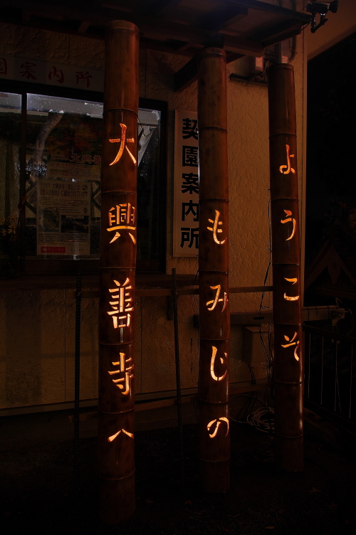 | 竹灯篭。「ようこそ もみじの 大興善寺へ」 |