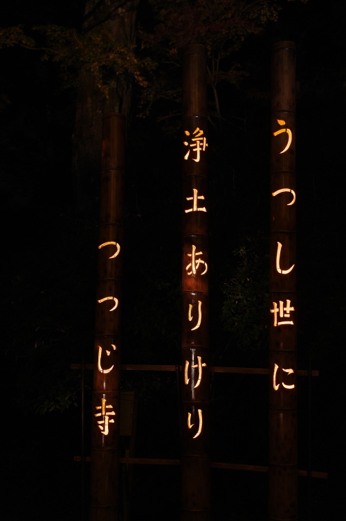 | 竹灯篭。「うつし世に 浄土ありけり つつじ寺」 |
