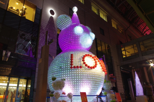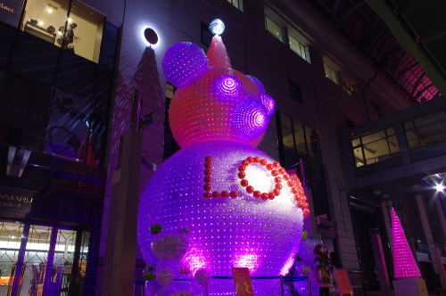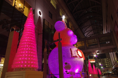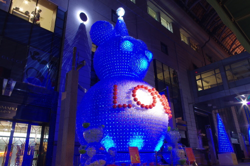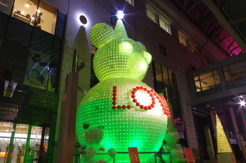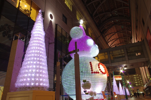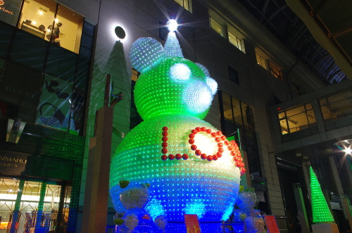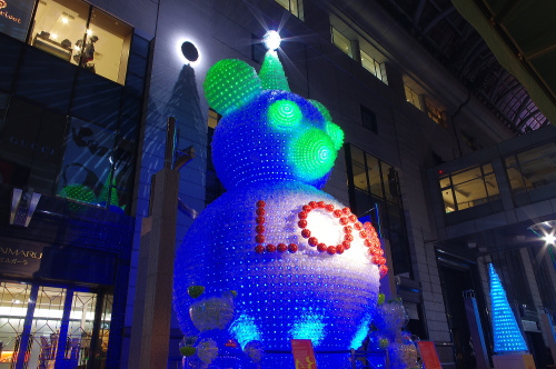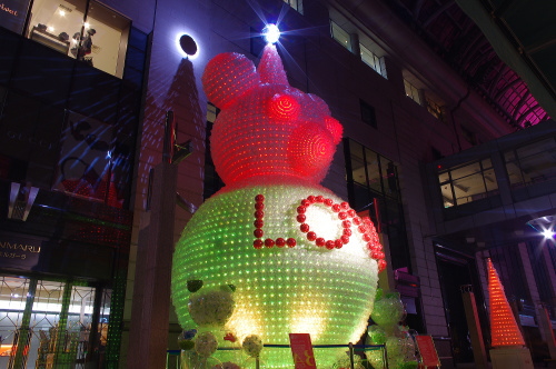 | 福岡の商業中心地・天神の一角をなす大丸・福岡天神店では、パサージュ広場にペットボトル3万本で作られた高さ10mのベアと高さ4mのツリー7本が飾られています。時間によって様々な色に変化していくベアは美しいものです。 |