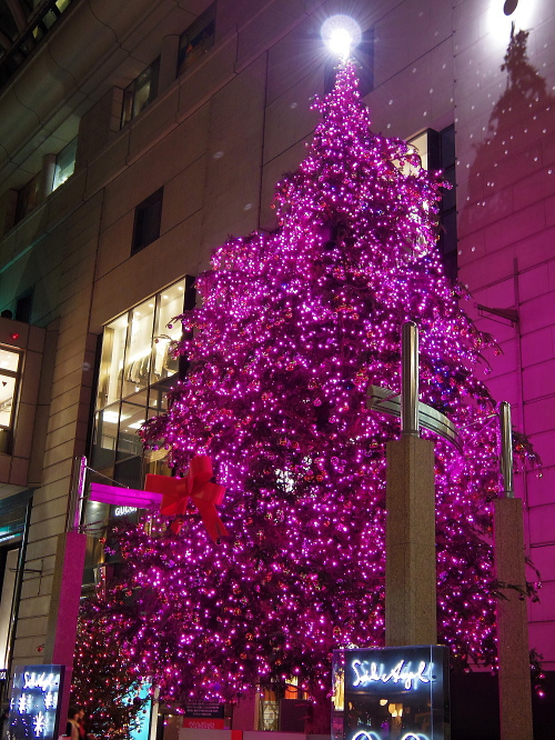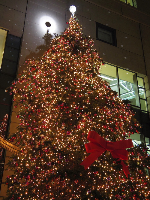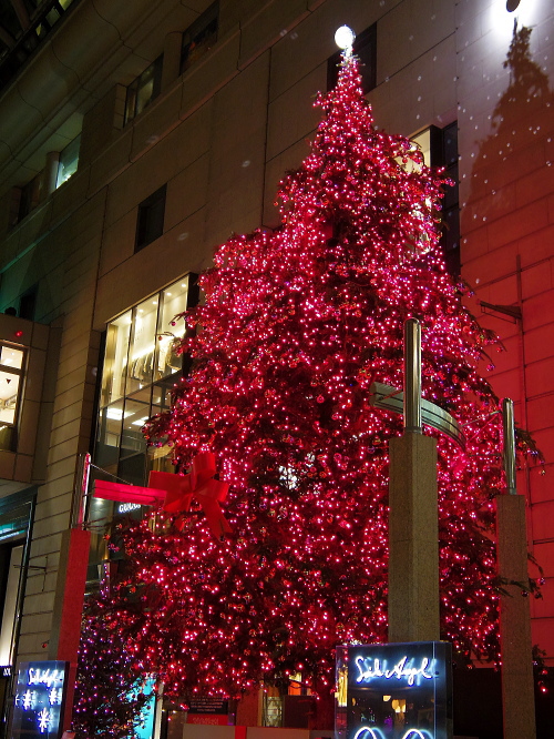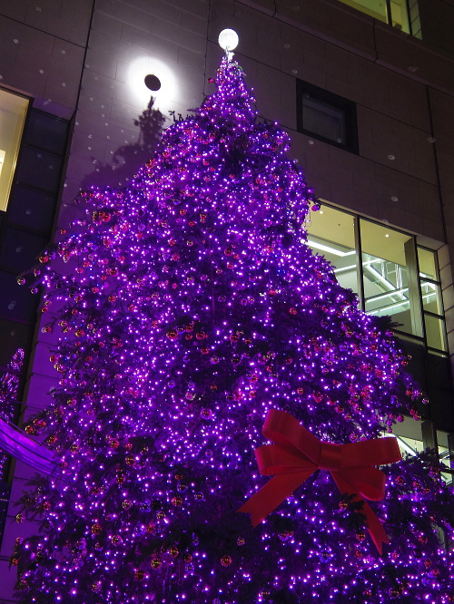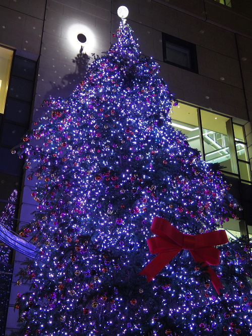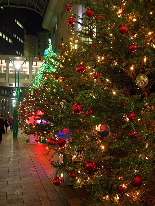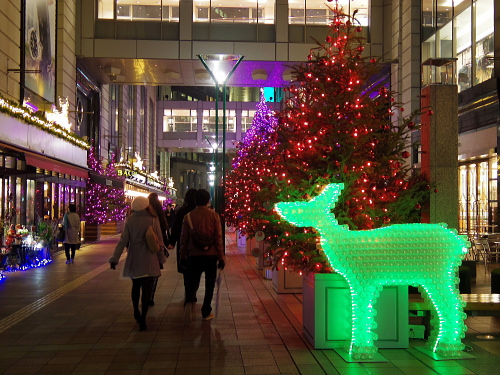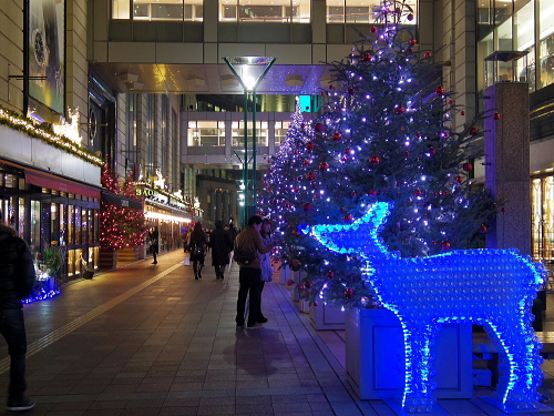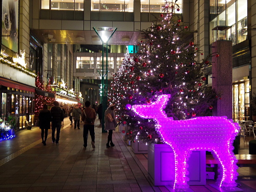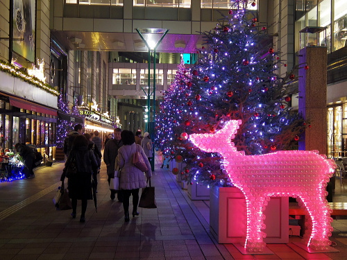 | 福岡市の商業中心地にある博多大丸のエルガーラパサージュ広場には、今年も美しいイルミネーションが点灯されています。2013年テーマは、「笑顔の森・パサージュ・〜幸せの笑顔咲くクリスマス〜」で、巨大なクリスマスツリーとペットボトルで作成されたトナカイが、様々な色に変化しながら点灯されます。 |