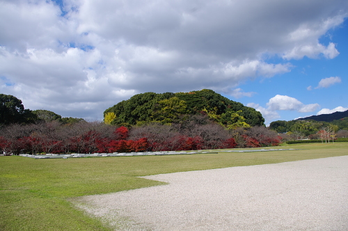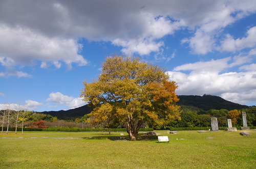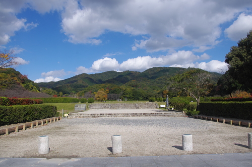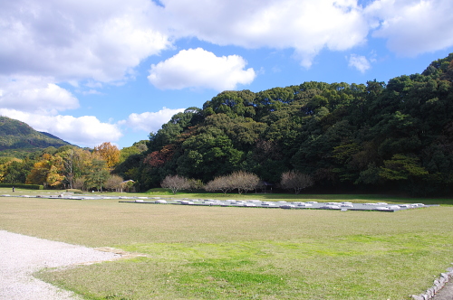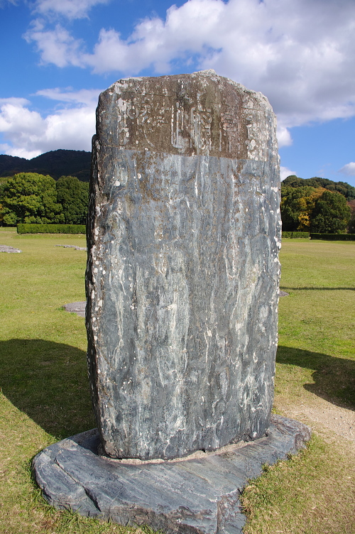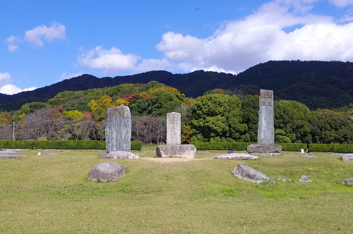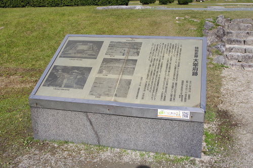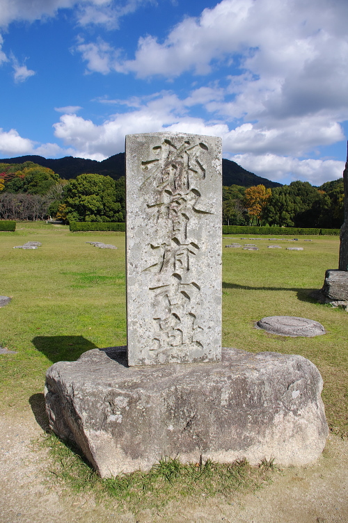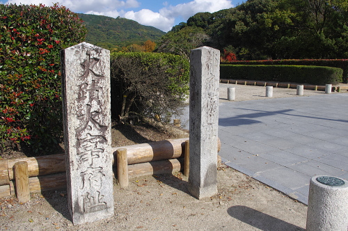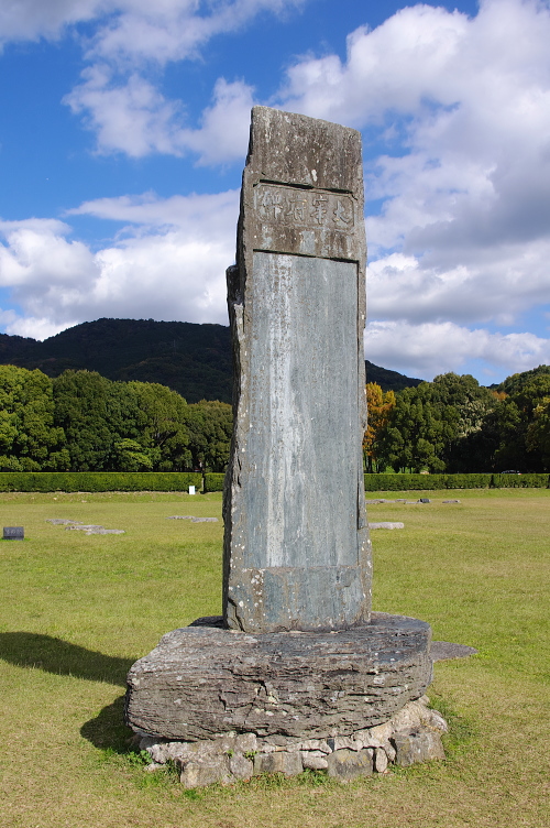 | 701年・大宝律令により政府機関として確立された太宰府は、西の防衛と外国との交渉の窓口として、平城京・平安京に次ぐ規模の大きさを誇っていたとされています。また貴族の左遷先として、学問の神様として祀られている「菅原道真」もこの太宰府に住んでいました。 現在では、「大宰府政庁跡」として国の史跡に指定されており、楚石と石碑がある公園になっています。 |