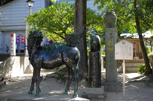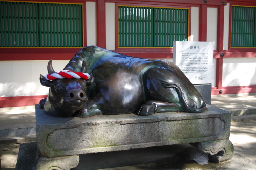 | 楼門横に安置されている御神牛。頭をなでると賢くなるそうです。 |