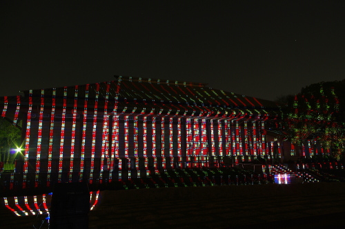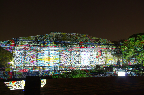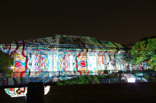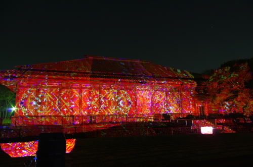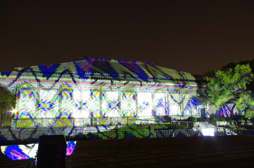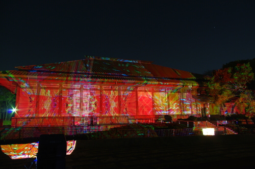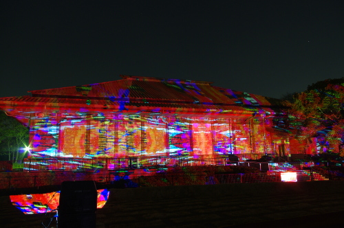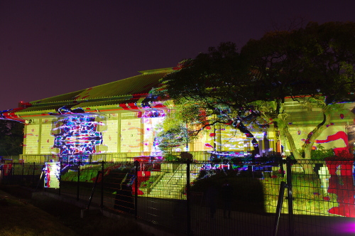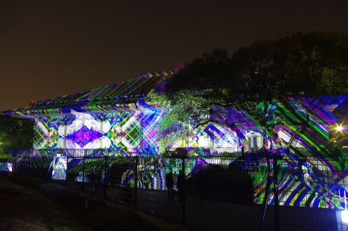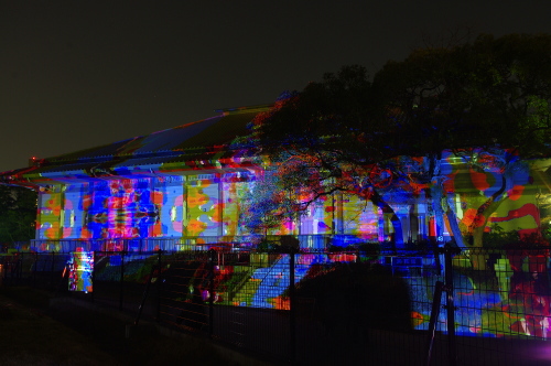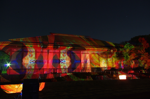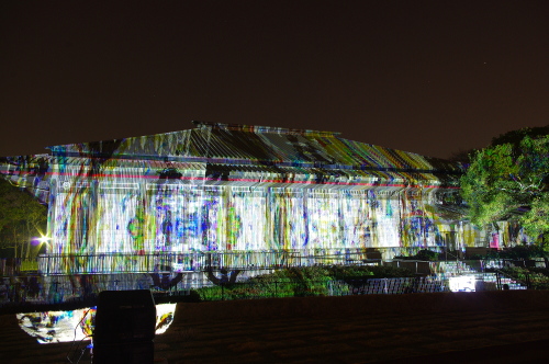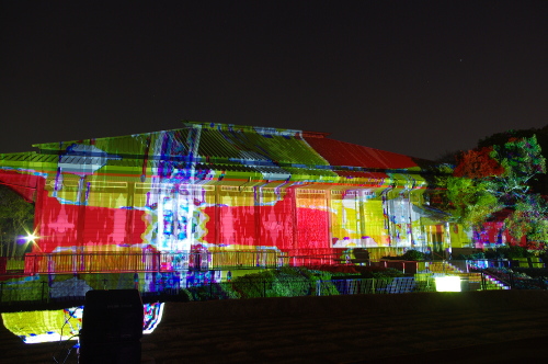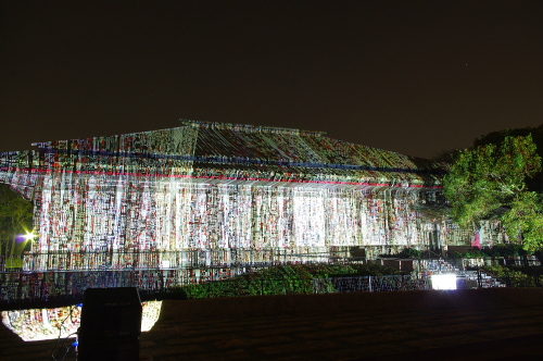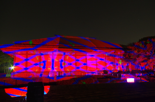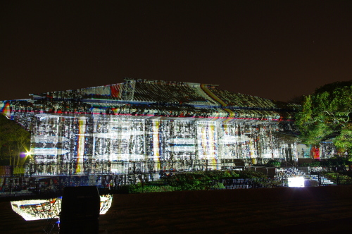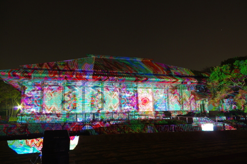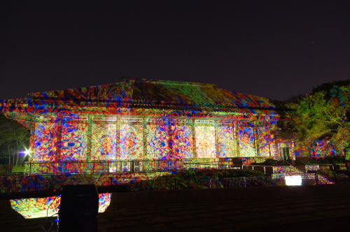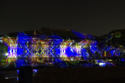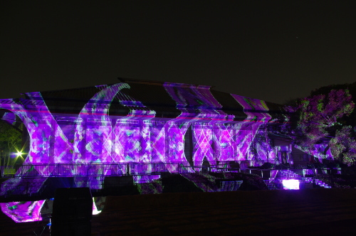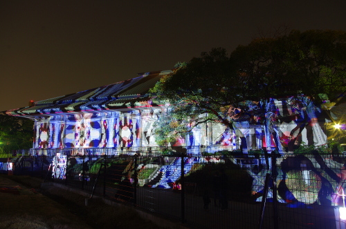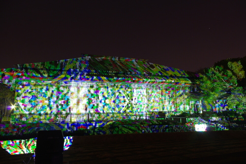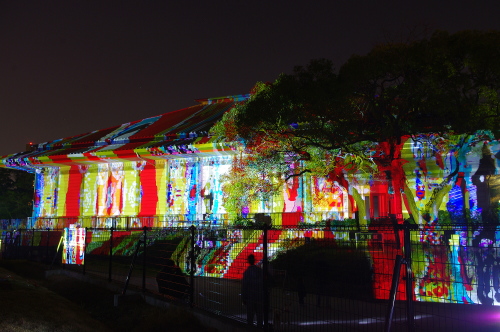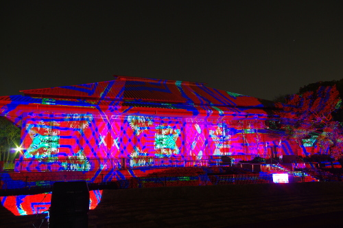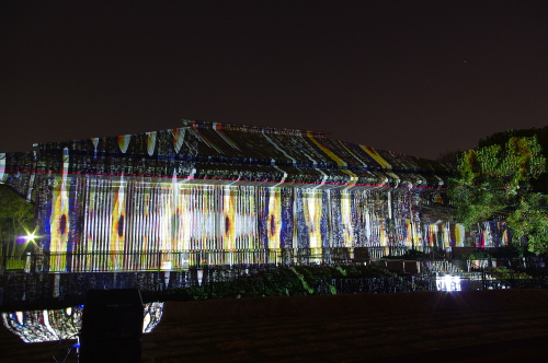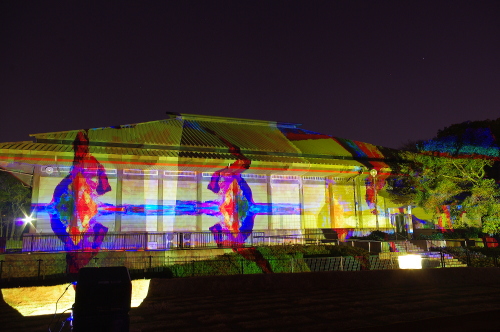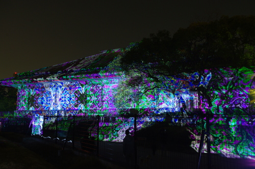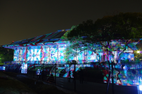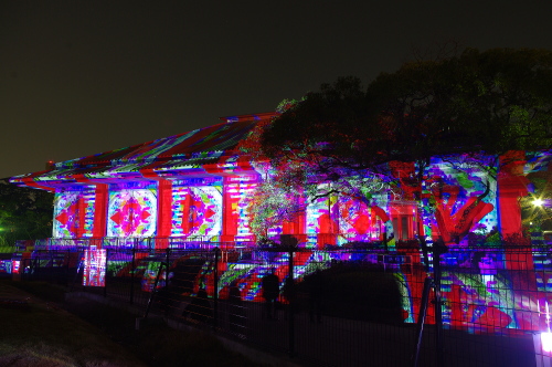 | 2012年3月に開催される「福岡城さくらまつり」のライトアップ点灯式に合わせて、27日・28日の二日間限定で福岡城跡の城壁と舞鶴公園内にある「鴻臚館跡資料館」をキャンパスにして、にデジタル掛け軸が上映されました。約10秒間隔で模様が変化する様々な模様が、12個の投射機から投射されます。 |