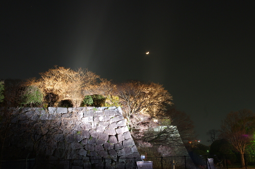 | 福岡城跡石垣ライトアップと月を写す。 |