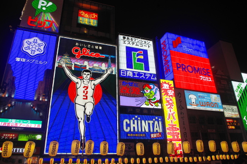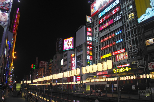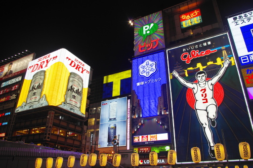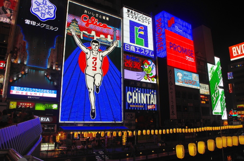 | 大阪・ミナミの歓楽街である心斎橋筋商店街と道頓堀商店街・戎橋筋商店街を結ぶ戎橋を中心に、ランドマークとしてグリコのネオンがあり、夜になるとこのネオンの店頭が派手に点灯して大阪らしい光景を見る事が出来ます。戎橋がかかる道頓堀川の両岸はリバーウォークとして整備されており、この遊歩道からも美しいネオンを見る事が出来ます。 |