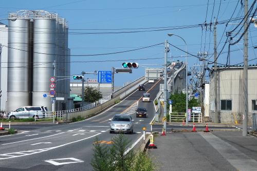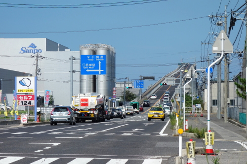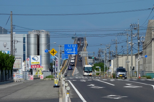 | 島根県松江市と鳥取県境港市を結ぶ江島大橋は、平成16年10月に完成・供用されたコンクリート製の橋で、勾配が島根県側が6.1%・鳥取県側は5.1%と急なもので、軽自動車のCMで有名になり、別名「ベタ踏み坂」とも呼ばれています。桁下を航行する船舶(5000トン船舶)を考慮し、中央径間250mのPCラーメン構造の橋梁としては日本一の長さの箱桁橋です。 |
