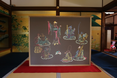 | 圓徳院で行われている「光の糸が紡ぐほとけさま展」。 背後には木下育應作「松竹梅図襖」。 |