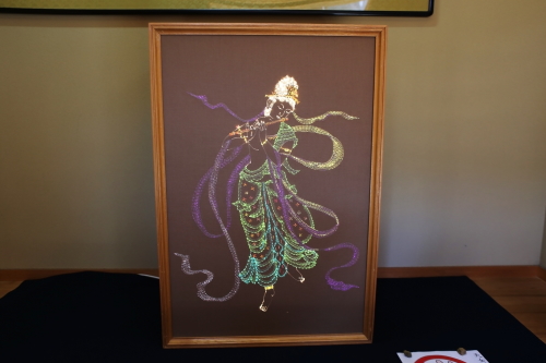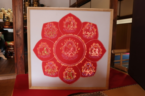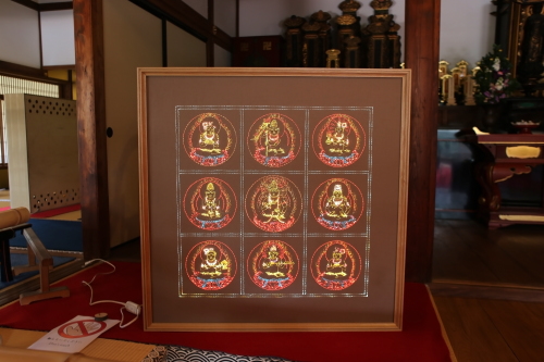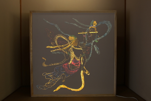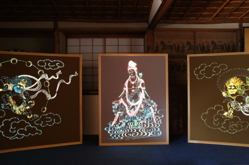 | 圓徳院で行われている「光の糸が紡ぐほとけさま展」。 背後には志村正作「雪月花図襖」。 |
