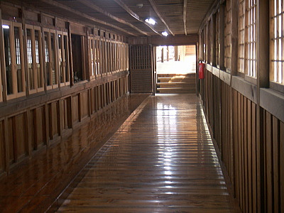 | 歩くと床から音が出る廊下「うぐいす廊下」。板の一枚一枚が独立した感じで張られていて、歩くと板が動く仕組みになっています。 |