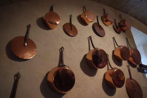 | 地下にある厨房の壁にかけられている食器類。 |