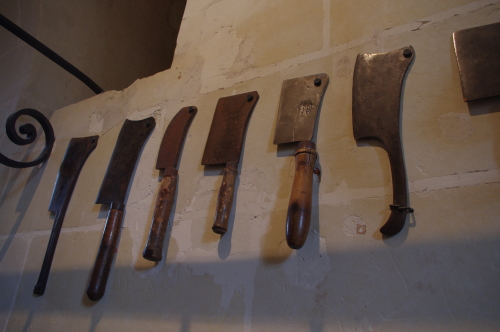 | 地下にある厨房にかけられている包丁。 |