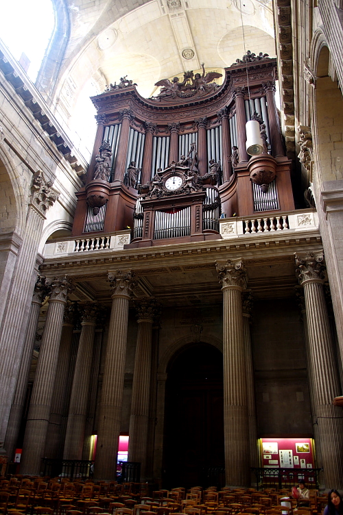 | 入口上部にある大きなパイプオルガンと精巧な日時計の指時針「サン=シュルピスのグノモン」。 |