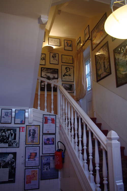 | 階段がある壁には様々な写真や絵が飾られています。 |