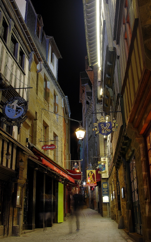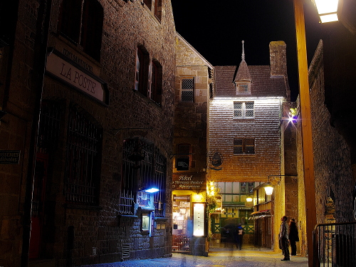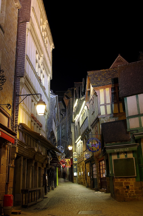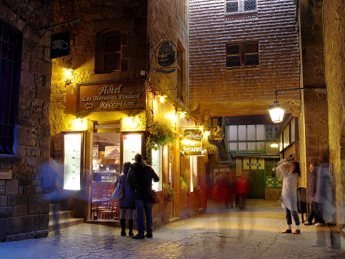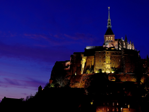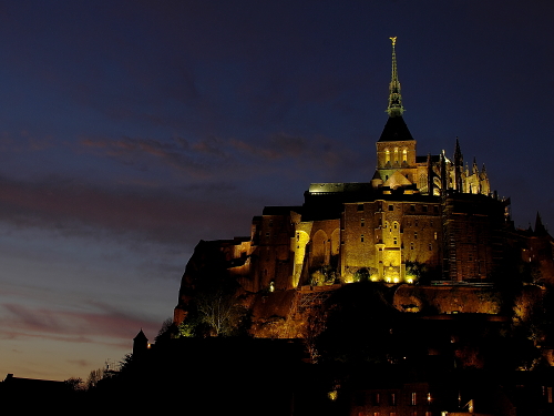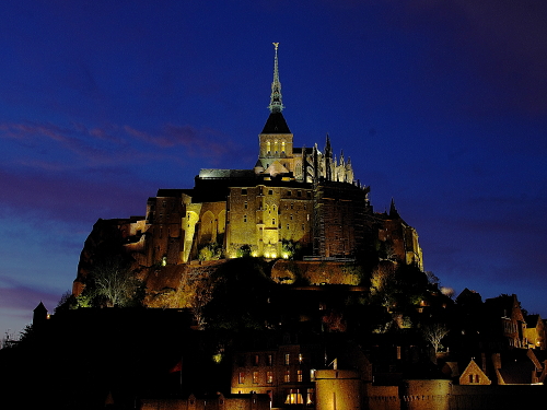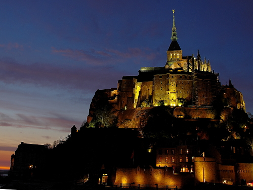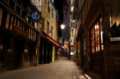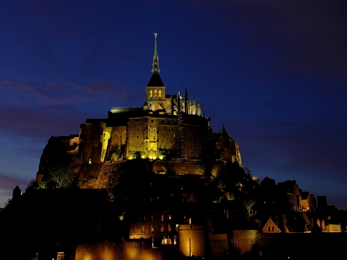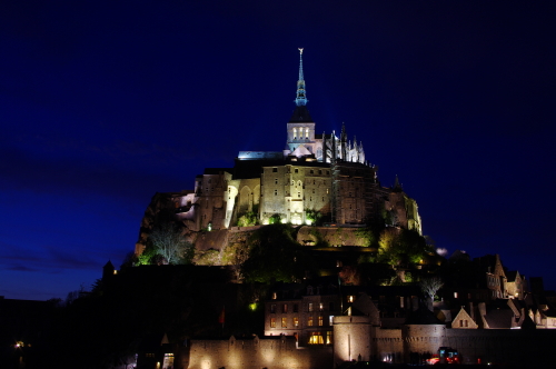 | 修道院の建物を中心に浮かぶ島であるモン・サン・ミッシェルは、日没頃から徐々にライトアップされます。その姿は美しく、且つ迫力があるものです。このライトアップを見るツアーも企画されており、ライトアップ時には観光客が三脚を立てて撮影する人が多くみられます。 島内でも街灯が灯り始め、昼間とは違った姿を見る事が出来ます。 |