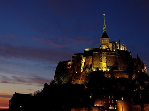 | ライトアップされた日没後のモン・サン・ミッシェル。 |