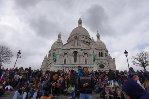 | パフォーマーに見入る観光客とサクレ・クール寺院。 |