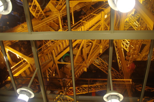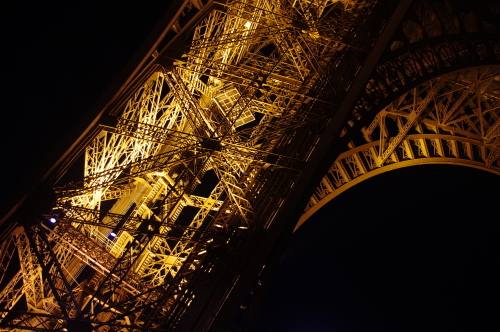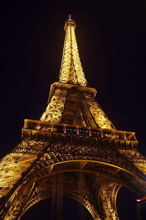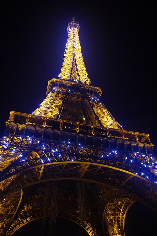 | ライトアップされたエッフェル塔の真下から見上げる。 |