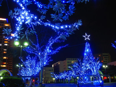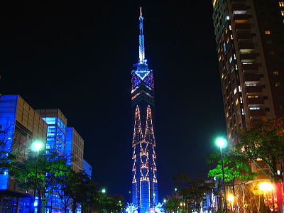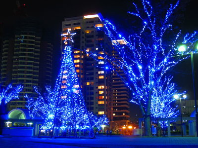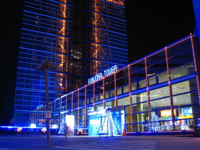 | 近年福岡のイメージ的象徴になっている福岡タワーですが、クリスマスの時期になると福岡タワーに高さ108mのツリーが現れます。青の電飾でロマンチックなムードに包まれるエリアに変貌します。 期 間:平成21年11月20日(金)〜 12月25日(金) 時 間:17:30〜23:00(12月23日〜25日は24時まで点灯) |
