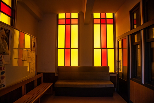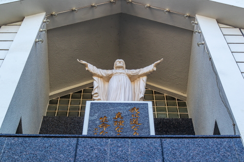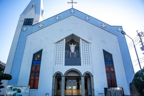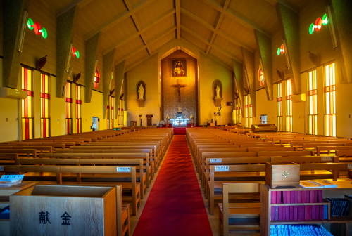 古くからの信徒は少なかったようです。 1873年にキリシタン禁制の高札を撤去した後の1888年9月に、旧堂崎小教区第2代主任司祭として着任したアルベール・ペルー神父は、1896年頃から下五島地区の司牧宣教の拠点として教会建立を推進し、1913年に郡立五島病院の建物と土地を取得して、 建物は教会堂兼司祭館として改造されて「イエズスの聖心教会」としてジャン・C・コンパス司教によって建立され、1914年に堂崎小教区から独立した歴史があります。 現在の教会堂は1962年4月に主任司祭松下佐吉神父により建立、 山口愛次郎大司教によって祝別献堂されたもので、同年に発生した市街地をなめつくした「福江大火」において、新教会も三方を火の海に囲まれたが奇跡的に類焼をまぬがれました。 駐車場:有 入館料:無料(寄付をお願いします) |