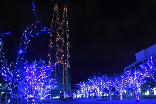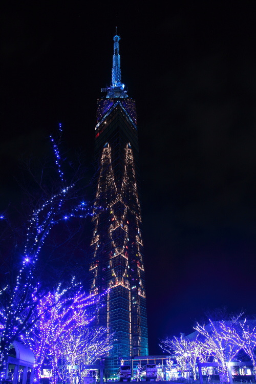 | イルミネーションと福岡タワーを見上げる。 |