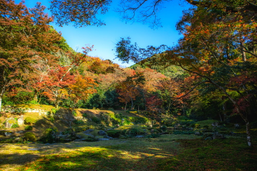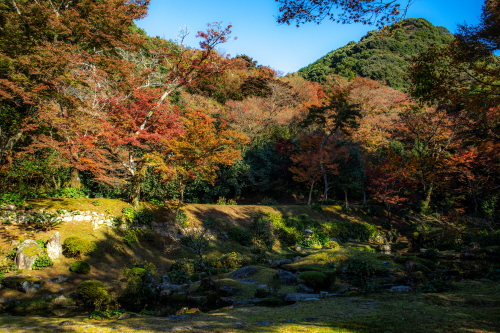 | 福岡県みやま市にある本吉山清水寺は、天台宗の開祖である最澄(伝教大師)が唐より帰国し、有明海の東方山中に美しく輝く光を発見しその光を求めて、一羽の雉を道案内にこの山に分け入り苔むした合歓(ねむ)の霊木に出会い、その合歓の霊木で千手観世音菩薩木像を2体作り、うち1体を京都の清水寺に安置して、もう1体を安置する堂を806年にこの地に創建したのが清水寺の創建とされています。 清水寺の本坊庭園は室町時代の作で、作者は雪舟であろうといわれている庭園です。東南北に山を囲らし心字の池を中心とする庭石の配置・植込み・池にそそぐ暖・急の滝など、自然と人工の美が溶け合い、春夏秋冬いつ訪れても飽きない名園で、特に正面の愛宕山からのぼる中秋の名月はすばらしく、その月が心字池の写るように工夫された借景式の泉水庭です。現在は新緑・紅葉スポットとして沢山の見物客で賑わう庭園になっています。 拝観料:300円(大人) 100円(小人) 拝観時間:9:00~17:00 休館日:月曜日(祝日・11月を除く)毎月18日 駐車場:無料 |
