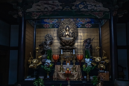 | 清水寺本坊庭園に安置されている神仏。千眼観世音菩薩・不動明王・ 毘沙門天。 |