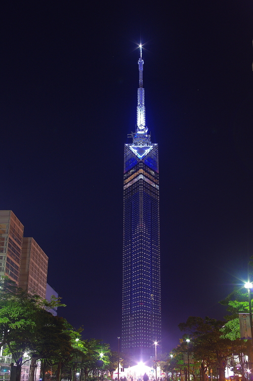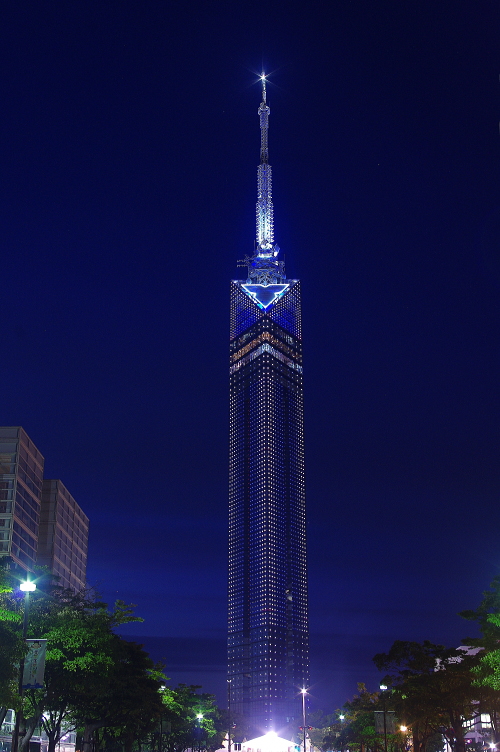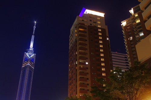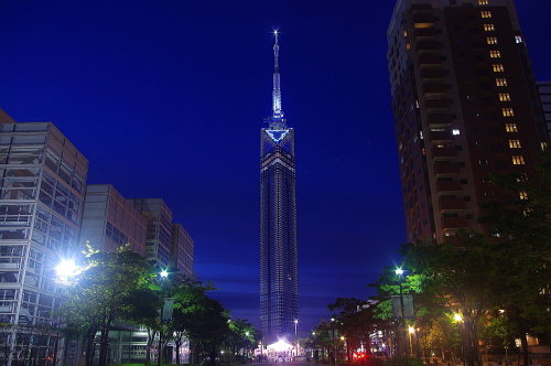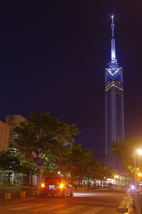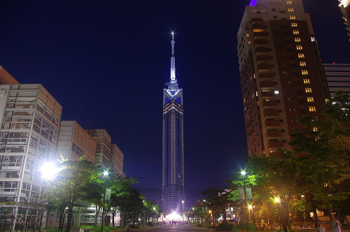 日没後の通常照明の福岡タワーとサザエさん通り。