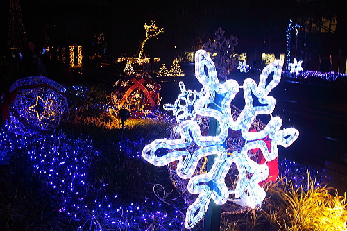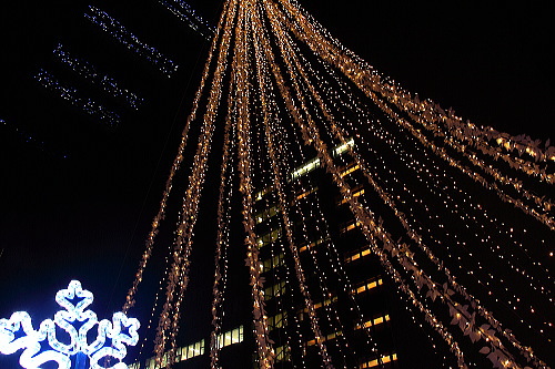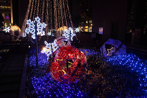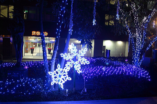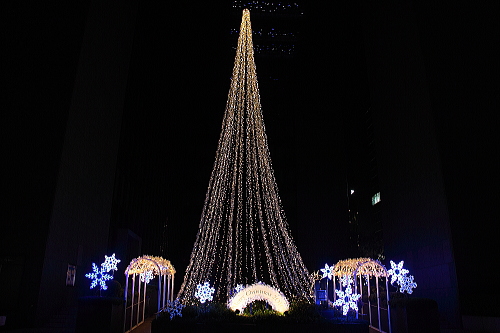 福岡の商業中心地・天神にある福岡銀行本店では、昨年よりLEDの数を増やしたツリーやモニュメントが飾られています。ベンチがあるので、ゆっくり座ってイルミネーションを観賞できます。